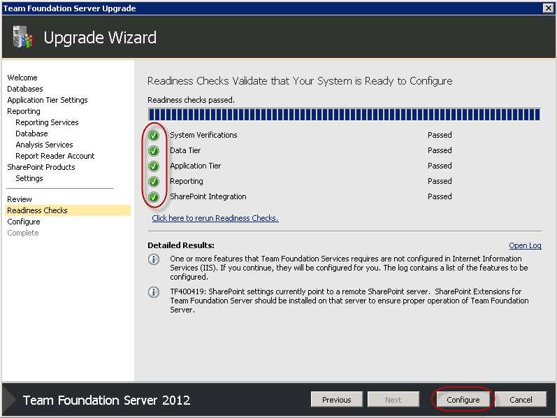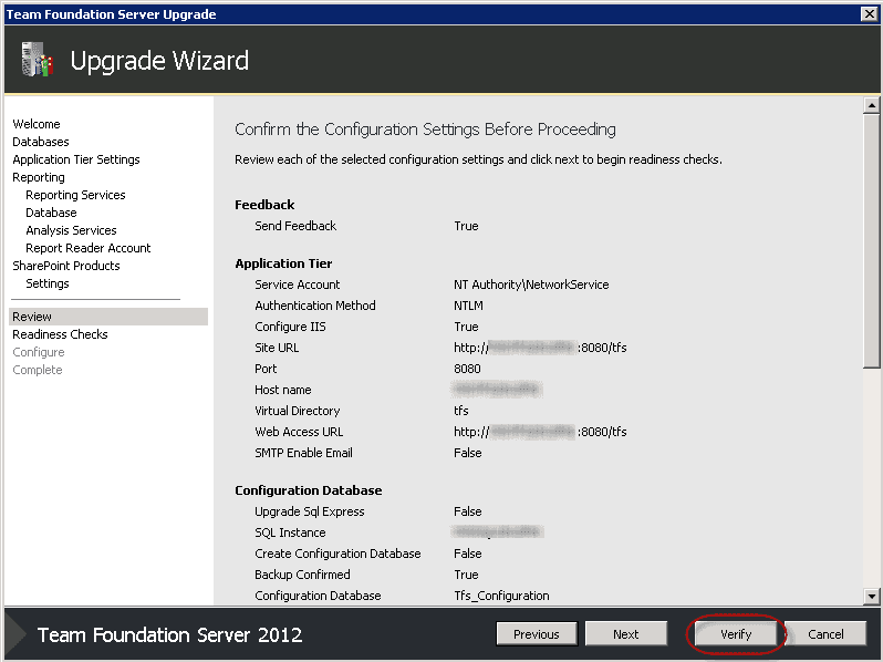 If database mirroring is enabled on your TFS database, an additional step is required to temporarily turn it off when upgrading the database schema. This may require additional permissions that are difficult to check in the Verify step. Verification may hang with no sign of what’s happening until you delve into the SQL Server logs. It’s safer (and avoids problems) if you manually turn it off before you start.