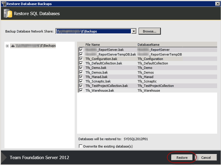 - Copy the TFS 2010 database backups to the TFS server or the new SQL Server instance. Make sure the URL is accessible from the TFS server via a network share.