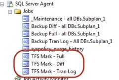 Figure: Add sp_SetTransactionLogMark stored procedure to every Tfs_* Database If you manually backup the TFS Databases make sure you add additional jobs that execute 1 minute before the backup kick off.