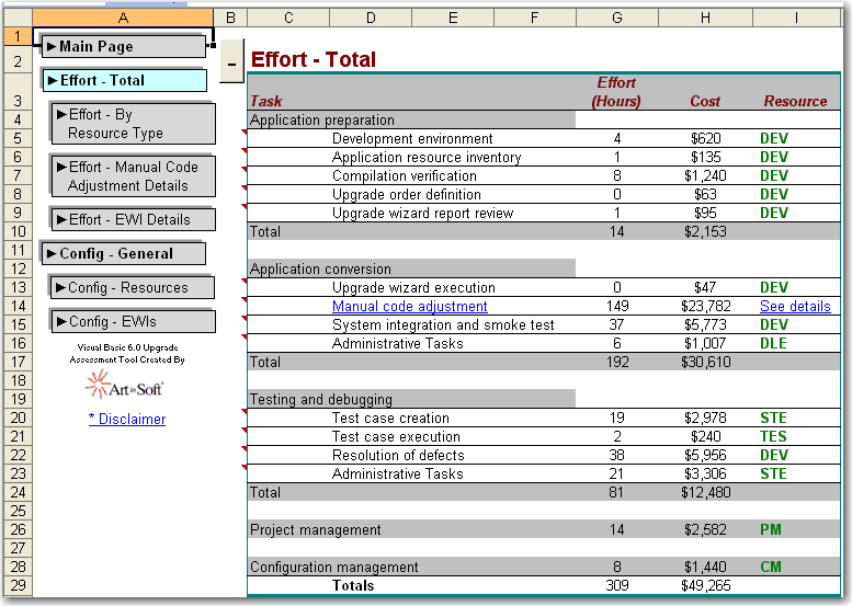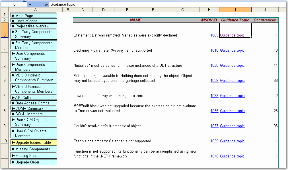 The Visual Basic 6.0 Upgrade Assessment Tool generates two Microsoft Excel 2003 files. This first of these is named MainReport.xls and contains a high level look at the results of the assessment.