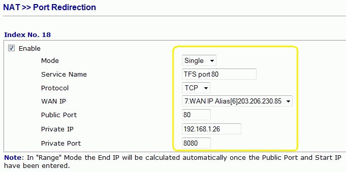 Rule to forward port 80 to the TFS port Figure: Rule to forward port 80 to the TFS port