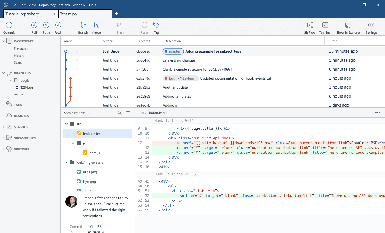 Drag-and-Drop Functionality: Enables performing many Git operations easily with just drag-and-drop