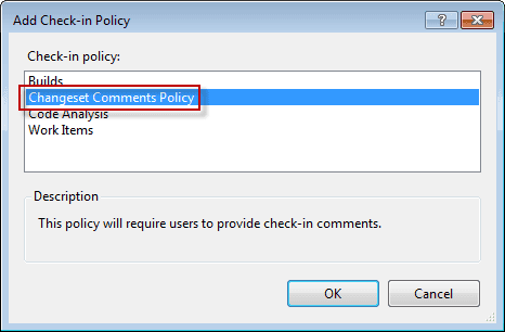 Figure: Go to Team Explorer | Source ControlFigure: Then Check-in Policy | AddFigure: Then select Changeset Comments Policy and OKFigure: Now you have the Changeset Comments Policy applied to your Team Project