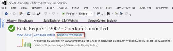 The developer is notified when a build succeeds and prompted to “Reconcile” their workspace
