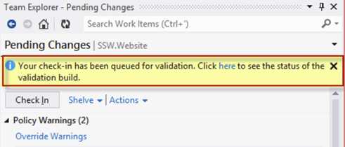 Note: This notification will disappear if you close it or navigate away from the Pending Changes window in Team Explorer.