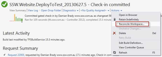 Figure: OK Example – Open the Build and choose Actions | Reconcile Workspace...