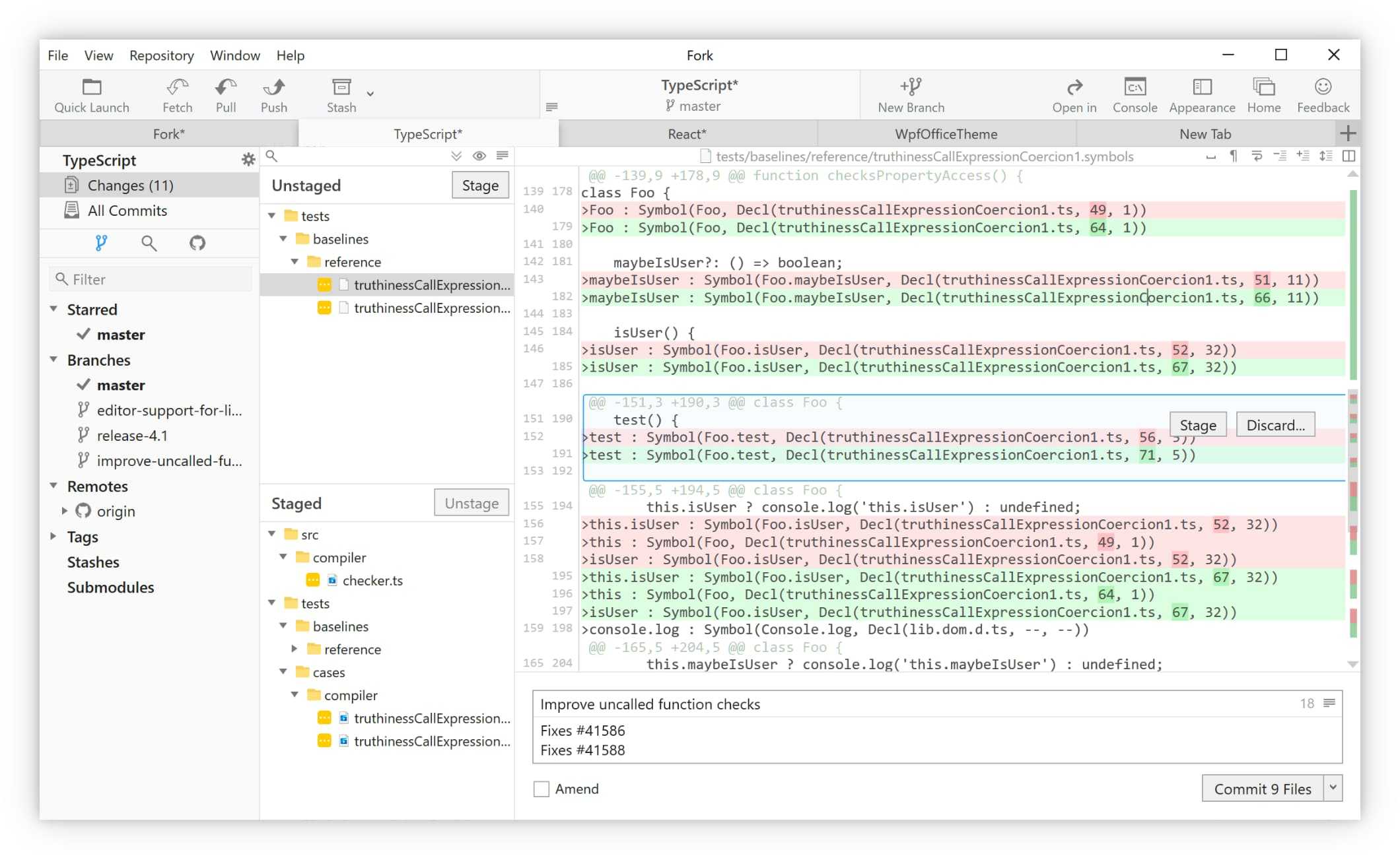 Efficient File Staging: Its ability to stage changes line-by-line efficiently and without resetting the file scroll view is praised, especially for feature-specific commits