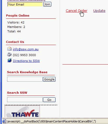 <a id="linkContact" href="javascript:sendEmail('44617669644073616D706C652E636F6D2E6175')" > CONTACT David </a>We have a program called SSW CodeAuditor to check for this rule.