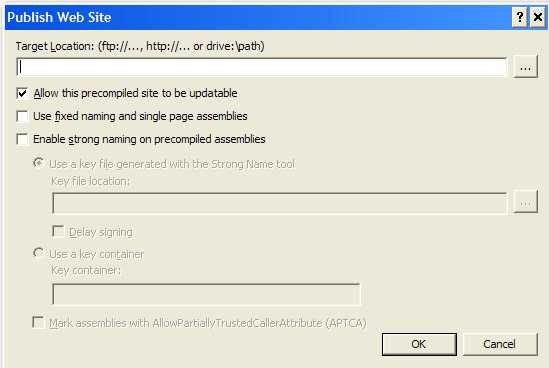 Publish Website dialog box is designed to precompile and deploy your website to a new location (whatever it is, ftp://, http:// or drive:\path). During the deployment, source code are removed automatically. Besides, the precompilation process finds any compilation errors and identifies the errors in the configuration file.j