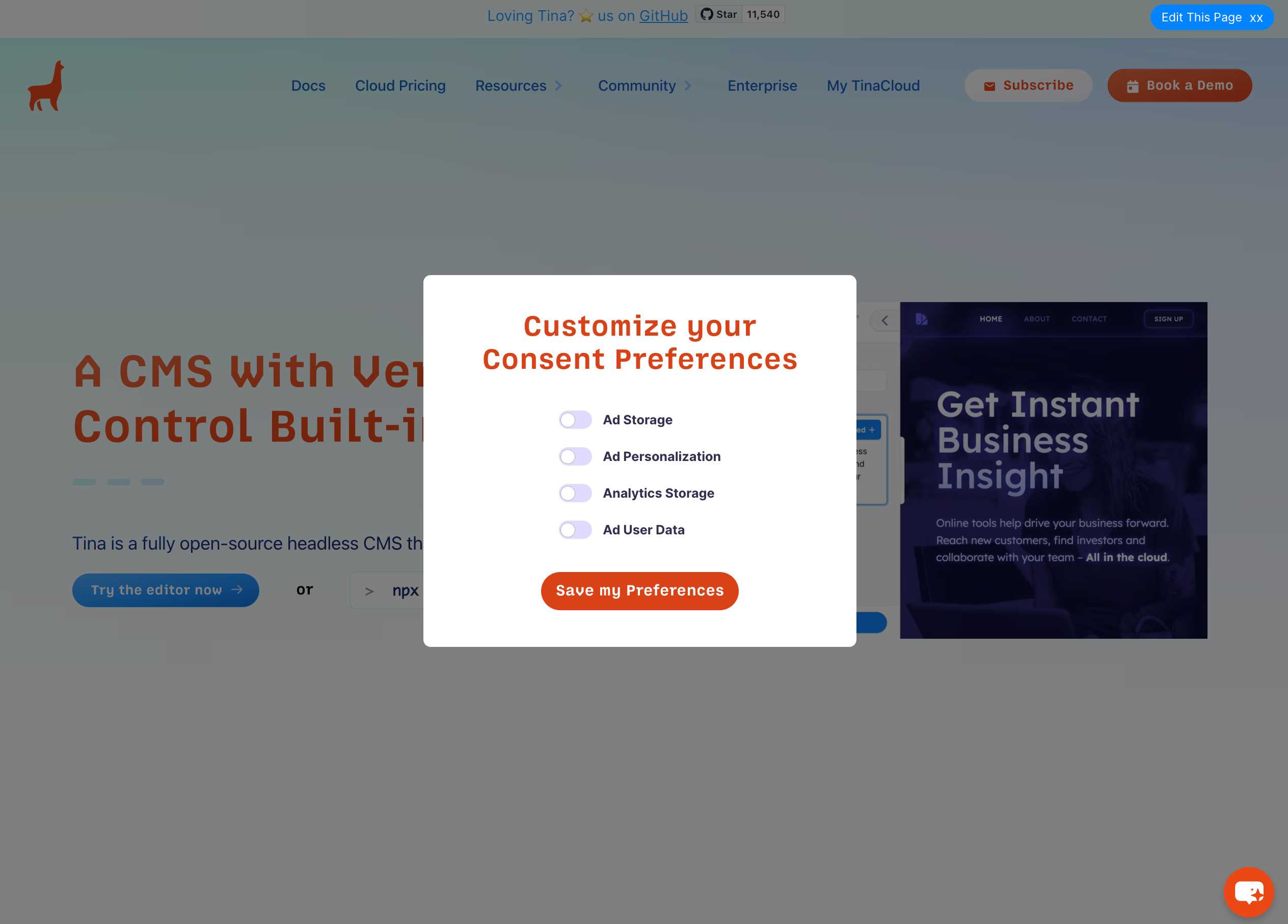 Figure: 🍪 Cookie Preference Modal on Tina.io Creating and sending cookies