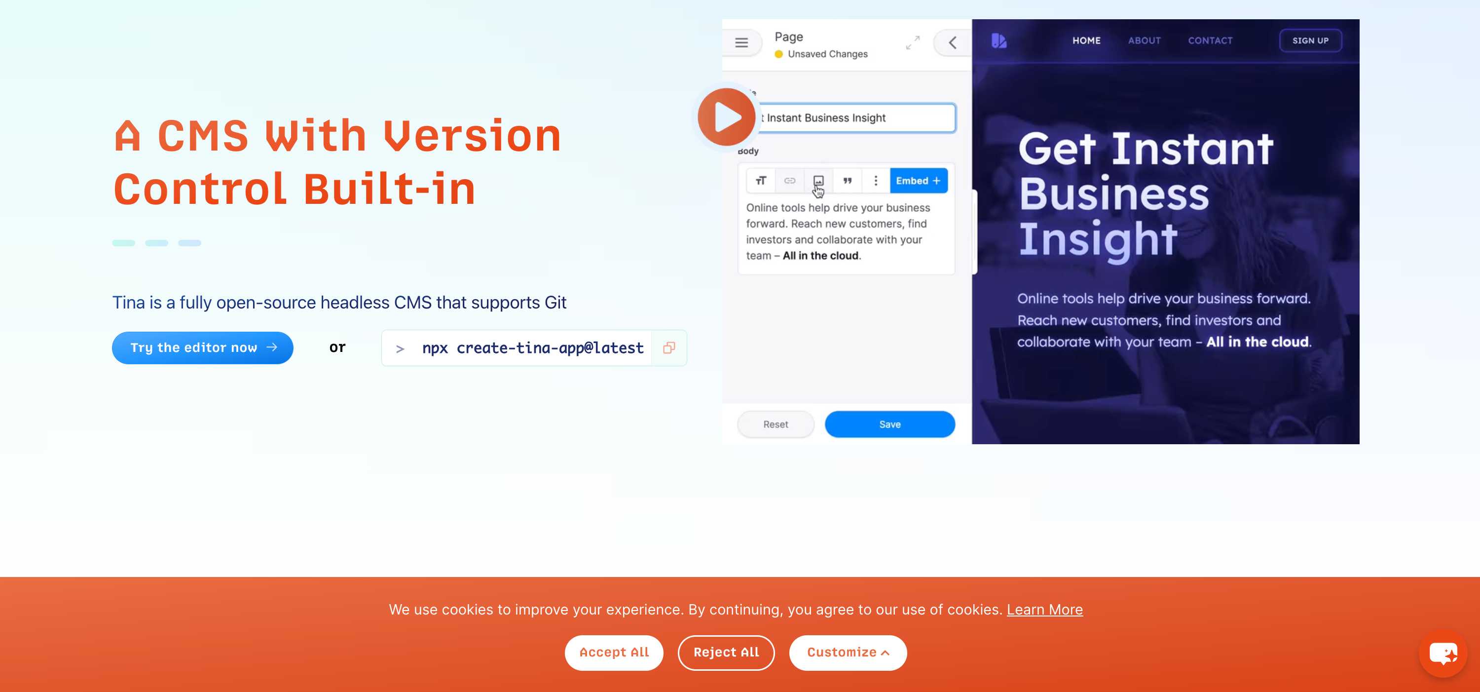 This section is very much customizable and will be different from site to site. Essentially you should create a pop-up, banner, or modal that will be prompted to users when visiting your site. Tina.io uses a banner along the bottom of the page.