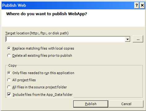 To access this dialog box, open a Web application project that you want to publish and click Publish ApplicationName on the Build menu.