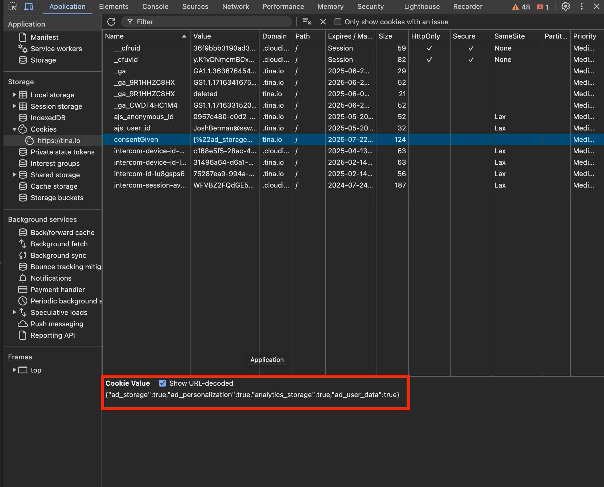 const acceptedConsent = { ad_storage: true, ad_personalization: true, analytics_storage: true, ad_user_data: true, }; Cookies.set('consentGiven', JSON.stringify(acceptedConsent), { expires: 365, });- Confirm your cookie is being sent correctly