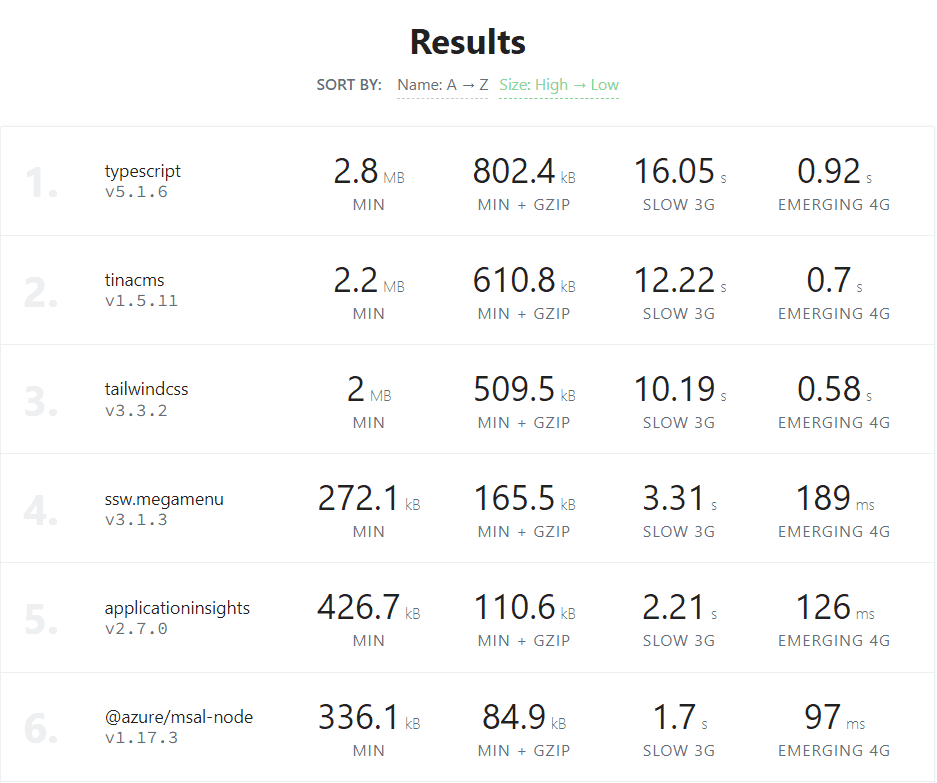 Figure: The list of packages from the package.json file, sorted by size Note: It is important to understand that not all of the packages in your