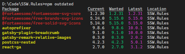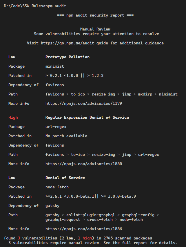 Regularly running this command can give a summarised report on known vulnerabilities in the referenced libraries.