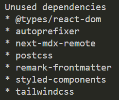 Figure: A list of the unused dependencies in a project Note: It is important to be mindful when using this tool of packages that are still in use in the project, either in the build steps or otherwise (e.g.