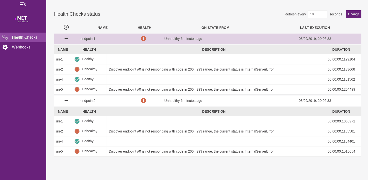 Figure: Sample Health Checks pageFigure: Sample Health of an endpoint being viewed in a timeline, so I can see when a resource was last healthy