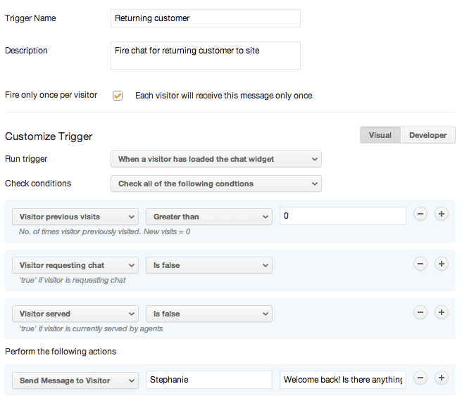 Repeat customers and return web visitors are valuable to your business. To help make sure these customers are finding what they need, you can proactively reach out to them via chat to welcome them back and see if there is anything you can provide guidance with.