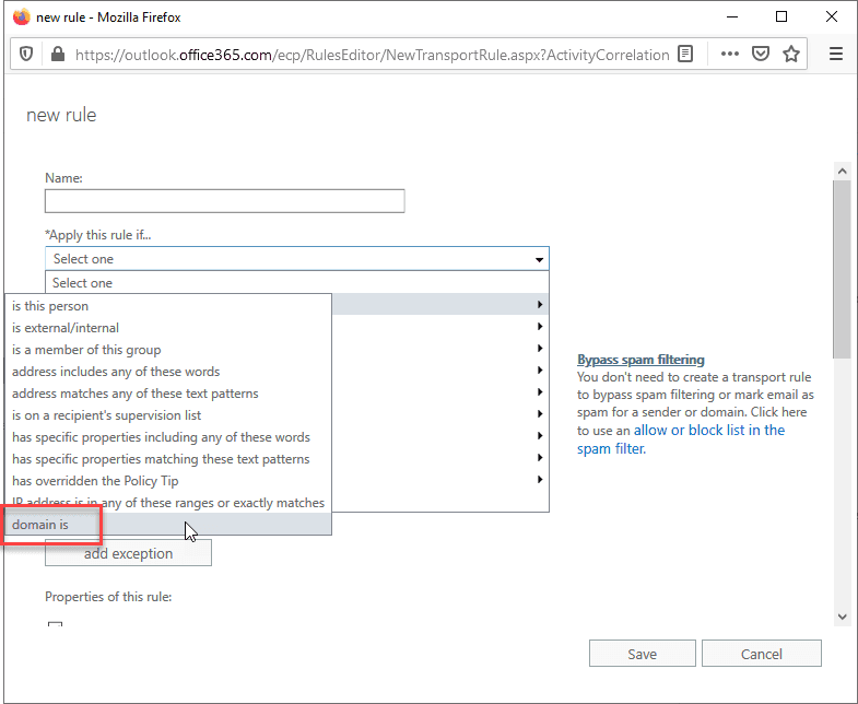 Figure: Bypass spam filtering setting in Exchange - On the new window that opens, type a good name for the rule | Apply this rule if... | domain is | type your Zendesk domain (in our case, ssw.zendesk.com):