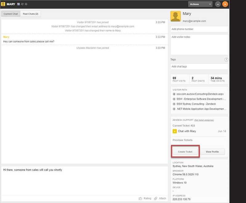 Figure: ticket is then created with chat history appended Note: You can also integrate with Dynamics 365 (aka CRM) to pass over lead details from Zendesk straight to a Dynamics 365 lead.