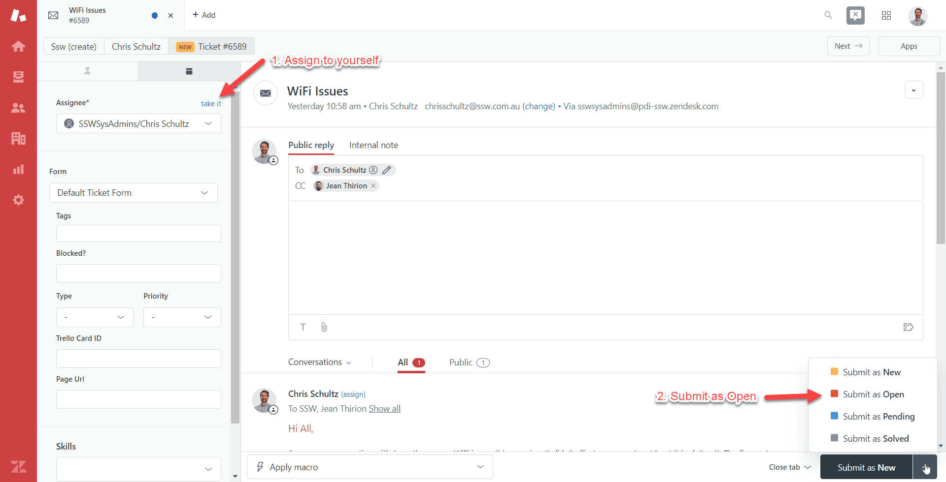Figure: Assign the ticket to yourself before working on it It can be tempting to quickly solve a ticket and then assign it to yourself after, when you're marking the ticket as solved - especially when you receive the requests as emails. However, this can mean that two people will start working on the ticket at the same time - doing the work, and taking screenshots ready for a good response. Even for a quick ticket, this will double the amount of work done. The process should be: