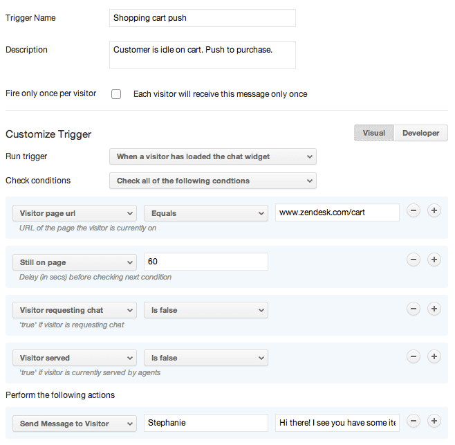 To provide customers that extra push to purchase, you can set up a trigger to initiate a proactive chat when a customer is on your shopping cart page URL for a specific length of time, more than 60 seconds, for example. You can send them a personalized message to see if they have any questions about the items in their cart.
