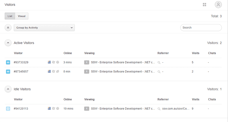 This is the primary view of the Visitor List, but you can also monitor them in a number of different ways: