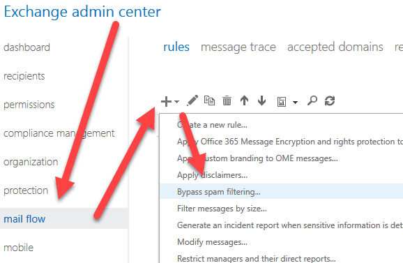 - Mail Flow | + icon | Bypass spam filtering: