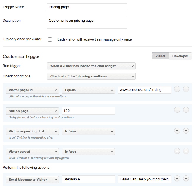 In some cases, you might want to reach out to your customer via chat before they have to reach out to you. You can set up Zendesk Chat triggers that initiate a proactive chat with a customer based on specified conditions that you define. Your customer can choose whether or not to respond.