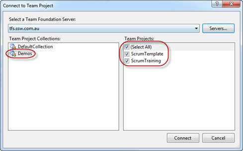 - In the Connect to Team Project dialog, select your Team Project Collection and tick the Team Projects you want to connect to your Visual Studio