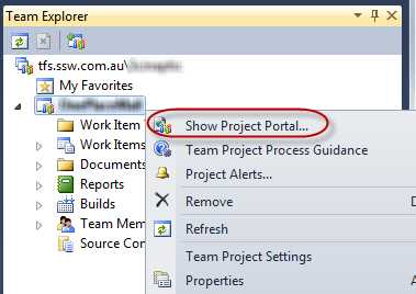 The easiest way to access the SharePoint Portal for a project is to right click the project name in Visual Studio and click Show Project Portal. This will launch a browser window where you will be able to see your SharePoint Portal for the project.
