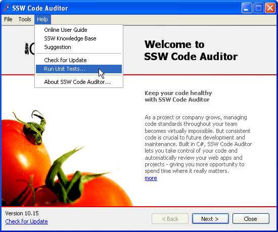 Unit tests should also be accessible from the Help menu to assist in troubleshooting when your users call up tech support.