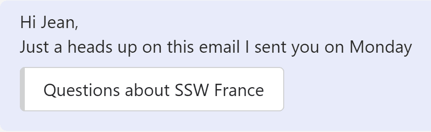 To make your messages more visually appealing, you can use "> {{ MESSAGE }}" in Microsoft Teams chats to highlight your message as a quote. This works particularly well when you want to refer to an email subject, i.e: