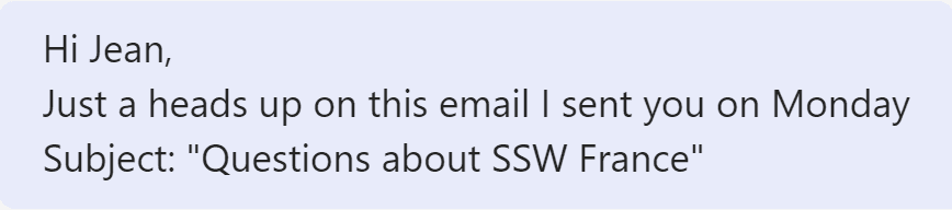Usually, when mentioning an email in a Microsoft Teams chat, the approach is straightforward, such as typing "email subject: Good morning."