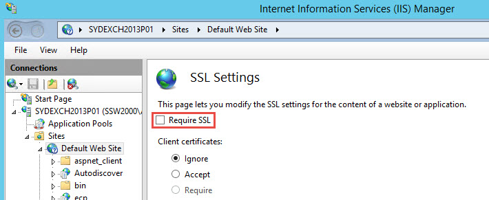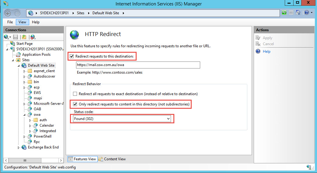 To simplify Outlook Web App (OWA) access for your users, you want to configure the Outlook Web App page to automatically redirect users to https. The HTTP redirect procedure in IIS Manager simplifies OWA URL and forces to SSL connection from mail.domain.com to mail.domain.com/owa .