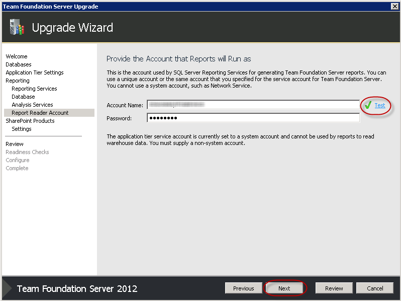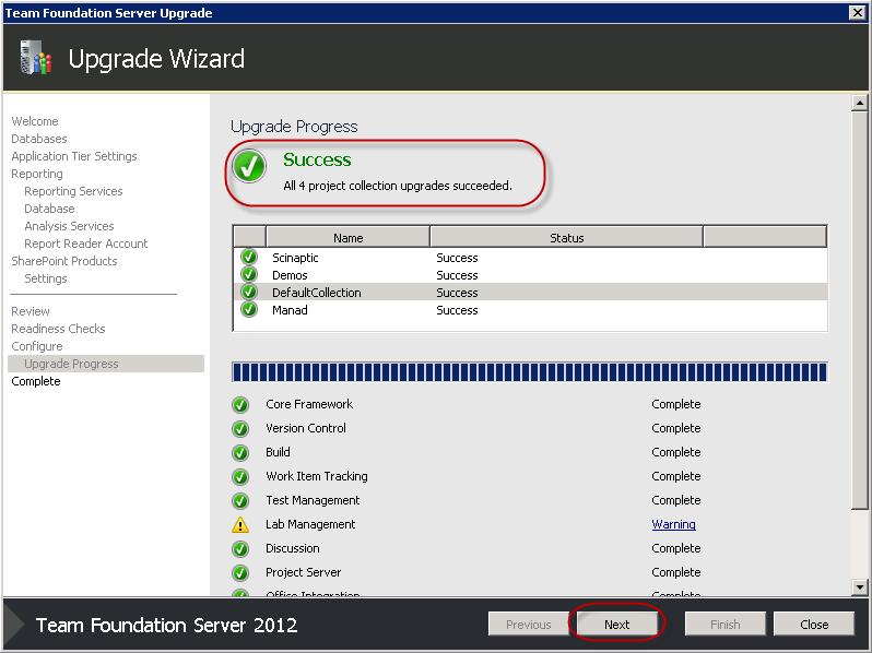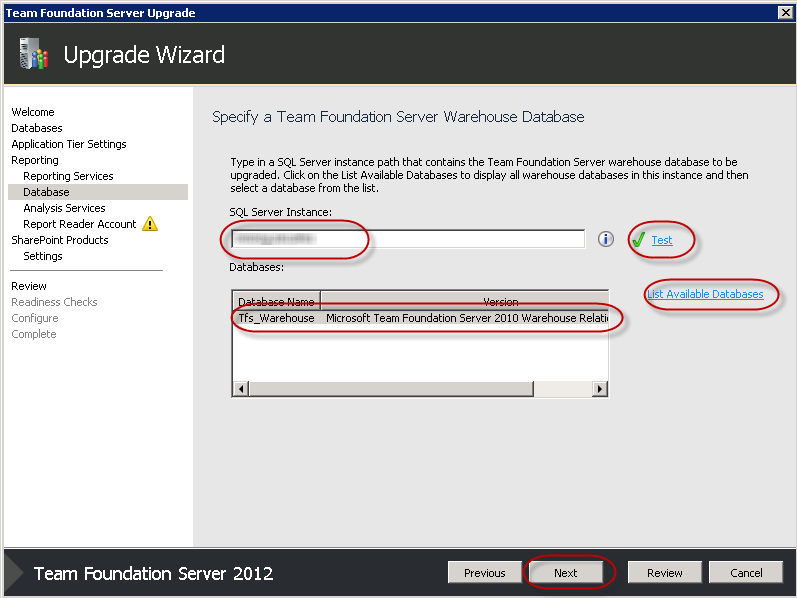 Click List Available Databases and check the Tfs_Warehouse database is shown, then click Next