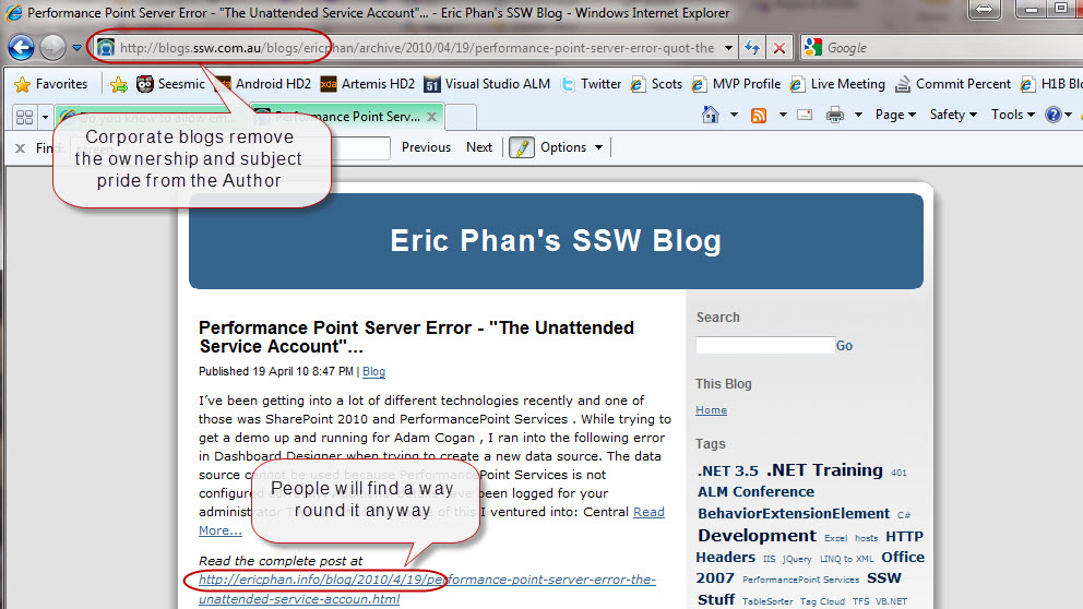 Tip: Get your employees to add an “SSW” category to their blog so you can aggregate their posts onto the corporate site.
