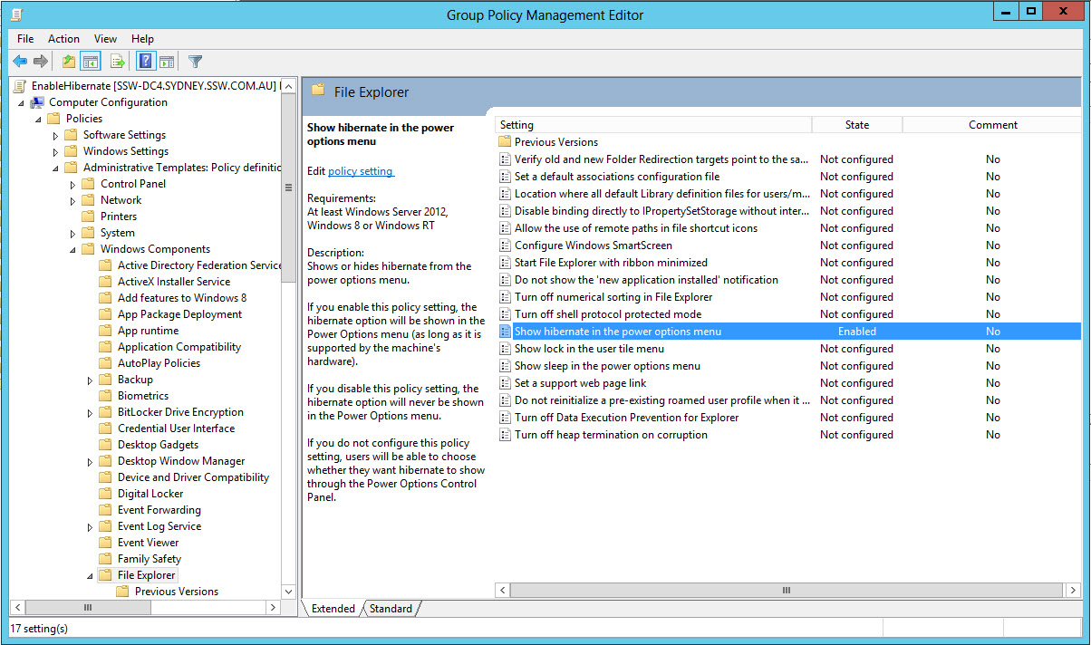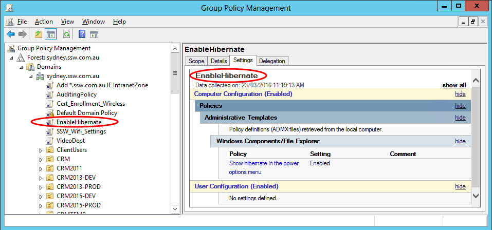Back in Group Policy Management Enable Link for "EnableHibernate"