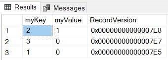 CREATE TABLE MyTest (myKey int PRIMARY KEY,myValue int, RecordVersion rowversion);GOINSERT INTO MyTest (myKey, myValue) VALUES (1, 0);INSERT INTO MyTest (myKey, myValue) VALUES (2, 0);INSERT INTO MyTest (myKey, myValue) VALUES (3, 0);UPDATE MyTest SET myValue = 1 WHERE myKey = 2SELECT * FROM MyTest ORDER BY RecordVersion DESC